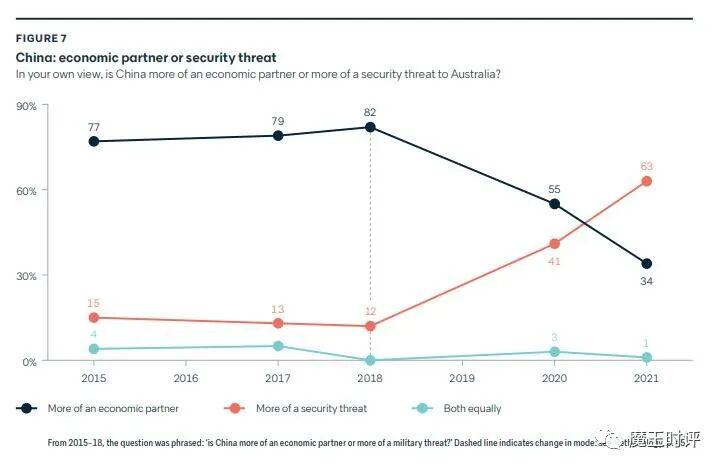 近日,亚洲新西兰基金会在2020年进行的一项年度民意调查出炉,结果显示认为中国友好的新西兰人从2019年的40%跌至31%,同时认为中国是威胁的新西兰人从2019年的22%增加到了35%。值得注意的是,这是该组织20年的民调史上新西兰首次认为中国是威胁的人数超过了认为中国是朋友的人数,同时还要注意,这个剧烈变化是从2019年之后才开始的。本月在澳大利亚也有类似的民意调查出炉,发现澳大利亚人对中国的观感也有类似的走向(如下图)。